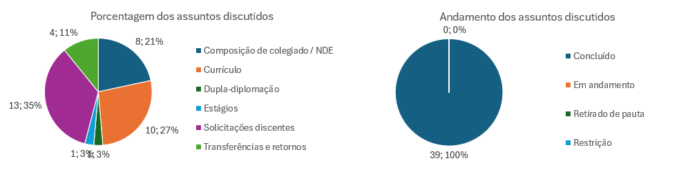 | 27.08.2025 | 03.2025-01 | Solicitações discentes | Solicitação de trancamento excepcional de matrículas – Estudantes 25250308 e 25200520 | Relator indicou o deferimento. Relato rejeitado por maioria de votos, sendo 3 votos favoráveis e 11 contrários. | Estudantes informados do indeferimento. | Concluído | Não foi necessário autuar no SPA | Ver ata |
