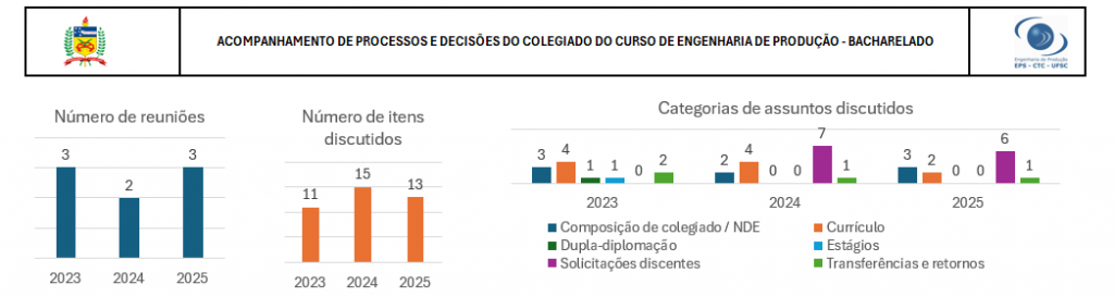 | 19.04.2023 | 01.2023-02 | Composição de colegiado / NDE | Indicação dos membros do Núcleo Docente Estruturante do Curso de Engenharia Da Produção - Bacharelado | Aprovado por unanimidade | Encaminhado à direção do CTC. Portarias emitidas. | Concluído | 23080.023996/2023-89 | Ver ata |